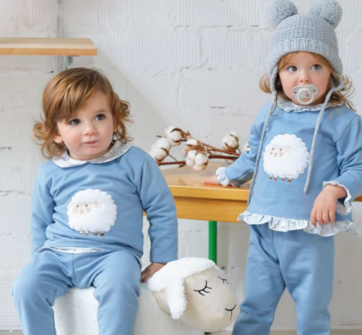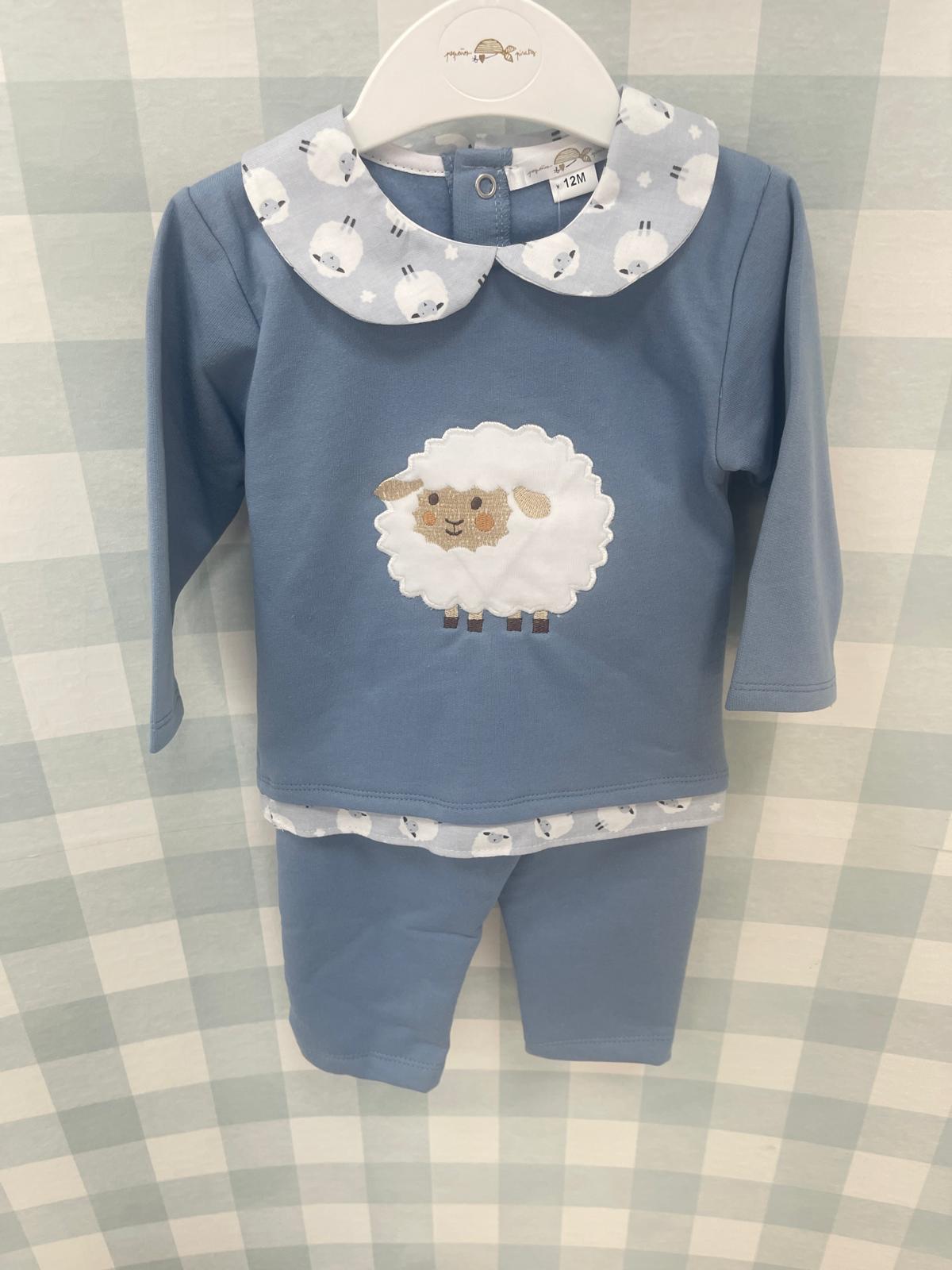 Conjunto algodón niño con cuello bebé ovejitas, dibujo ovejita en el centro y bajo camisa ovejitas. Interior afelpado. Abotonado por detrás con broche presión para mayor facilidad.