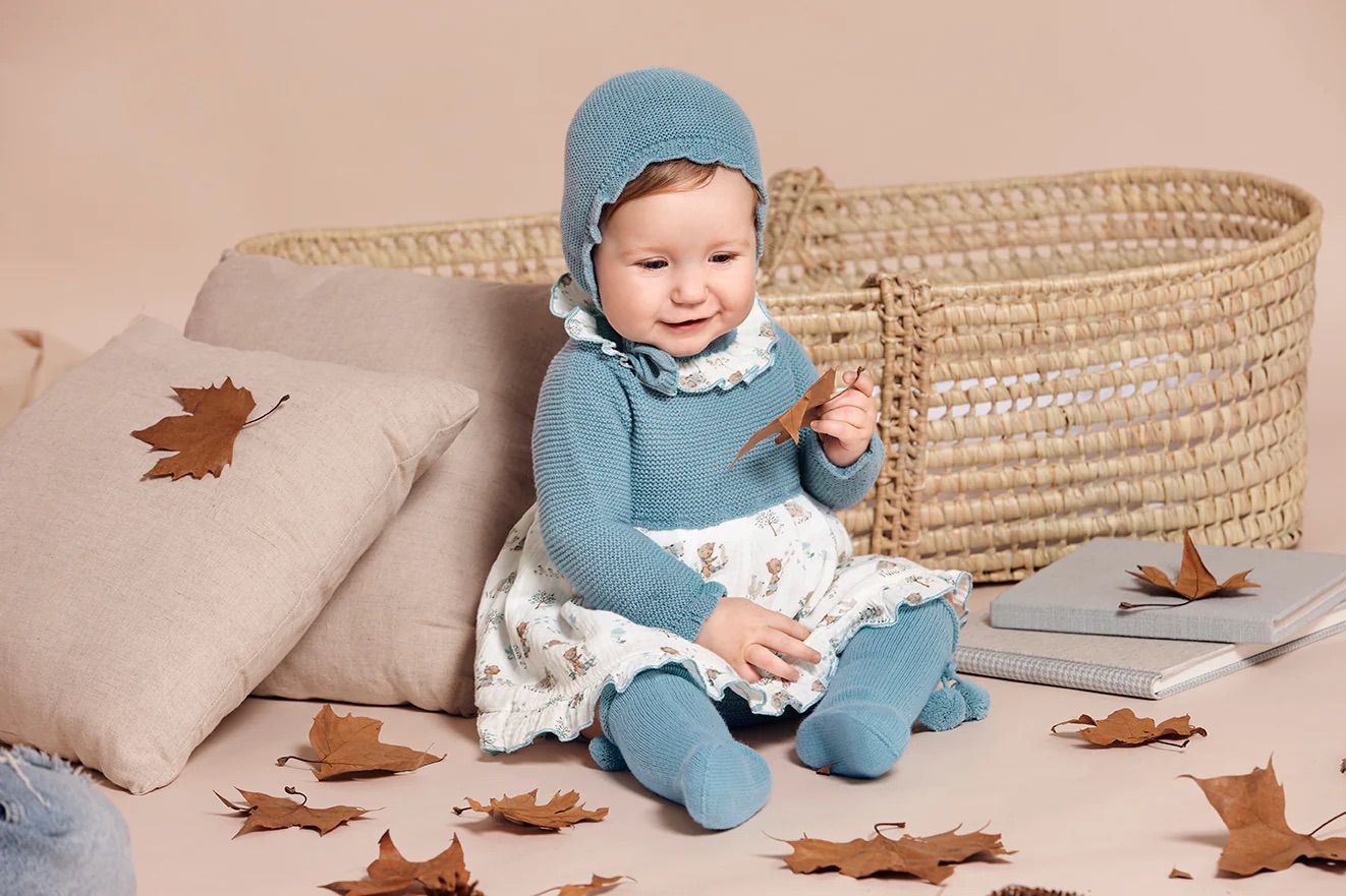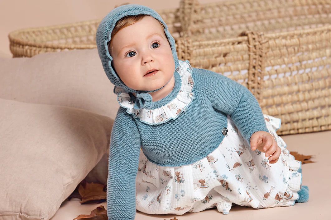 Jesusito con cuerpo de punto tricot y falda de tejido estampado con animalitos en tonos suaves. Cuello volante estampado a juego. Incluye ranita y gorro de punto.